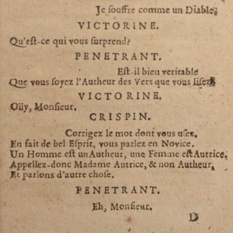 https://twitter.com/oMulta_Paucis/status/1536605212986703872 "Un homme est un autheur, une femme est autrice", Crispin bel esprit, une pièce de M. de La Thuillerie publiée en 1696 https://twitter.com/oMulta_Paucis/status/1536605212986703872 https://pbs.twimg.com/media/FVMeTC-XEAE3quf?format=jpg&name=900x900