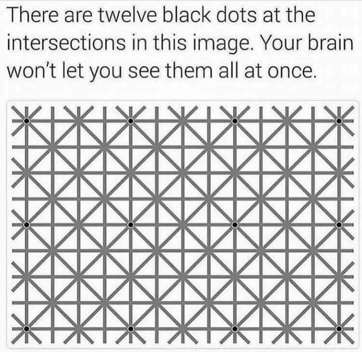le cerveau ne foit qu'un ou deux des 12 points noirs aux intersections https://pbs.twimg.com/media/FntXveXWYAEzy2a?format=jpg&name=900x900 via https://twitter.com/BigBangSciCom/status/1619984968024817665