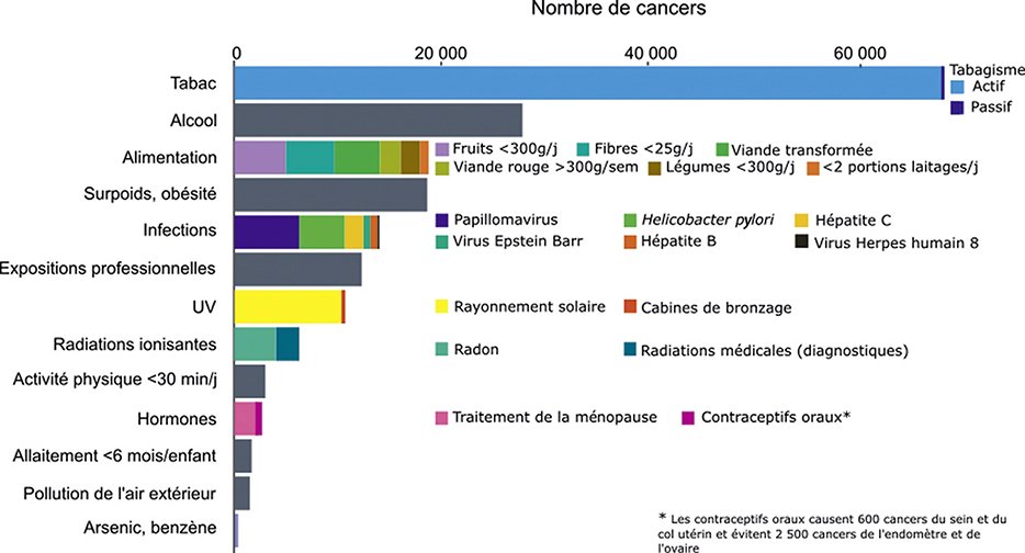 Le tabac, en particulier, est la cause évitable numéro 1 de cancers : il est impliqué dans 17 localisations de cancers différentes et cause à lui seul 20 % de l’ensemble des nouveaux cas de cancer en France (environ 68 000 par an, avec 45000 décès mais le tabac tue plus de 70 000 personnes par an de manière très prématurée, avec perte de plus de 10 ans d’espérance de vie moyenne, équivalent à la ville de Cannes chaque année !).